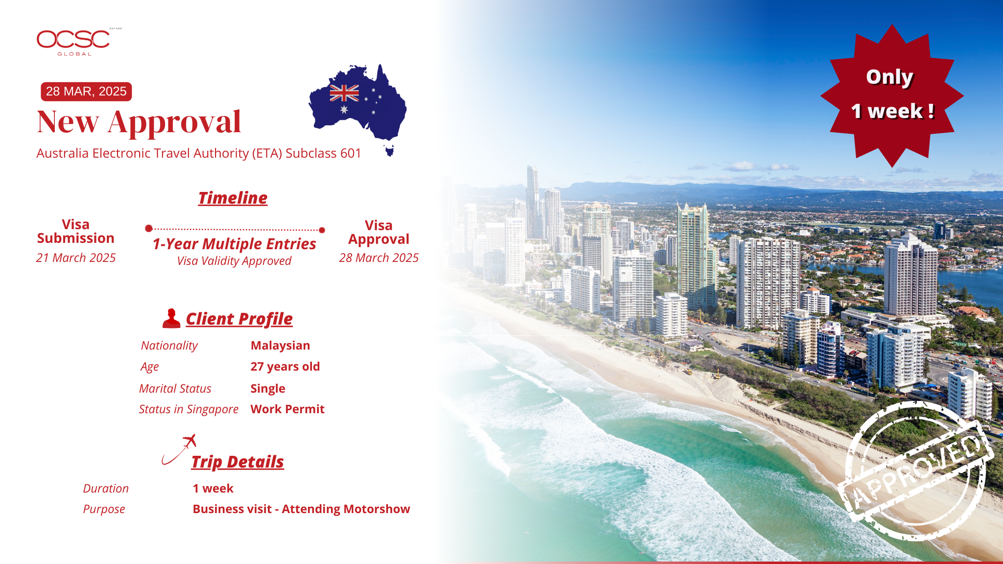 If you’re planning a business trip or short visit to Australia and need a Subclass 601 ETA, OCSC Global makes the application process simple and stress-free.